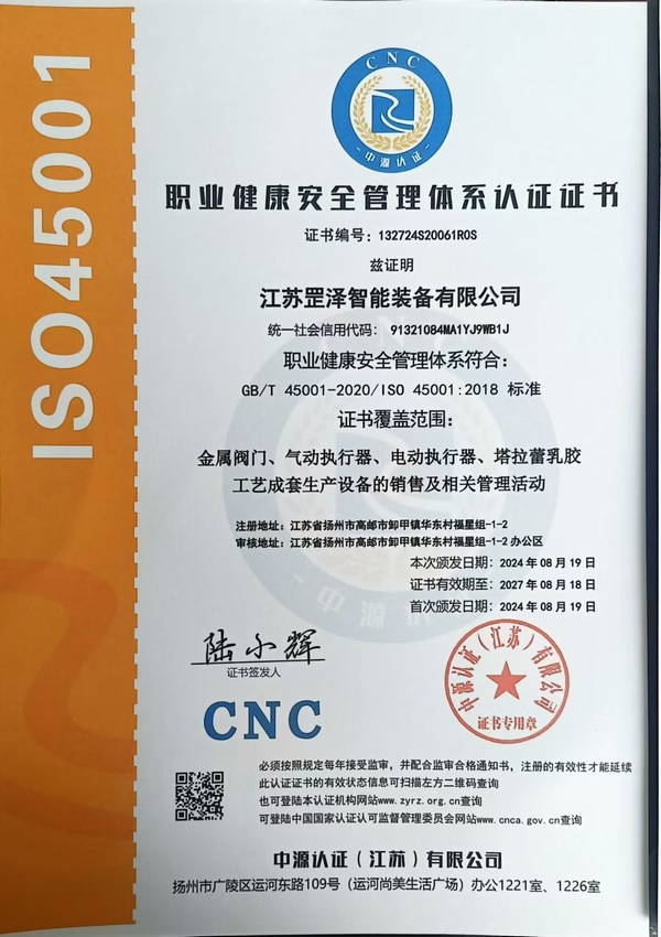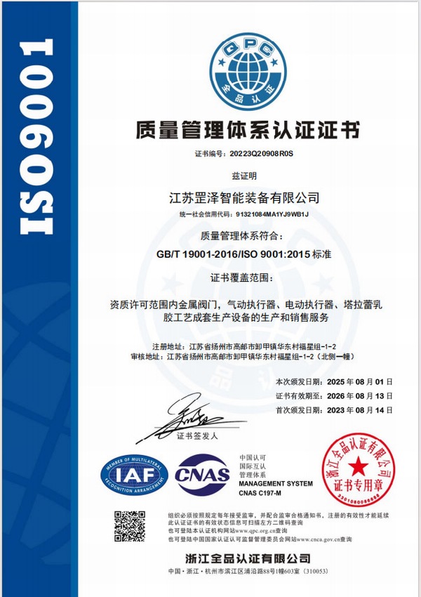 江苏罡泽智能装备有限公司(简称“罡泽智能”)创建于2019年,注册资本1000万元,注册地址位于高邮市卸甲镇华东工业区。公司以“创新、高效、品质、规范、可靠”为核心经营理念,专注于工业阀门研发制造与自动化控制系统集成两大核心业务板块,为各行业客户提供专业、可靠的技术与产品解决方案。凭借过硬的技术实力与严苛的品质管控,公司已先后通过多项权威认证,斩获多项荣誉资质,奠定了行业内的专业地位。