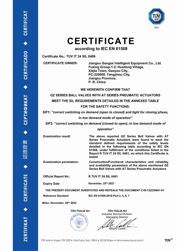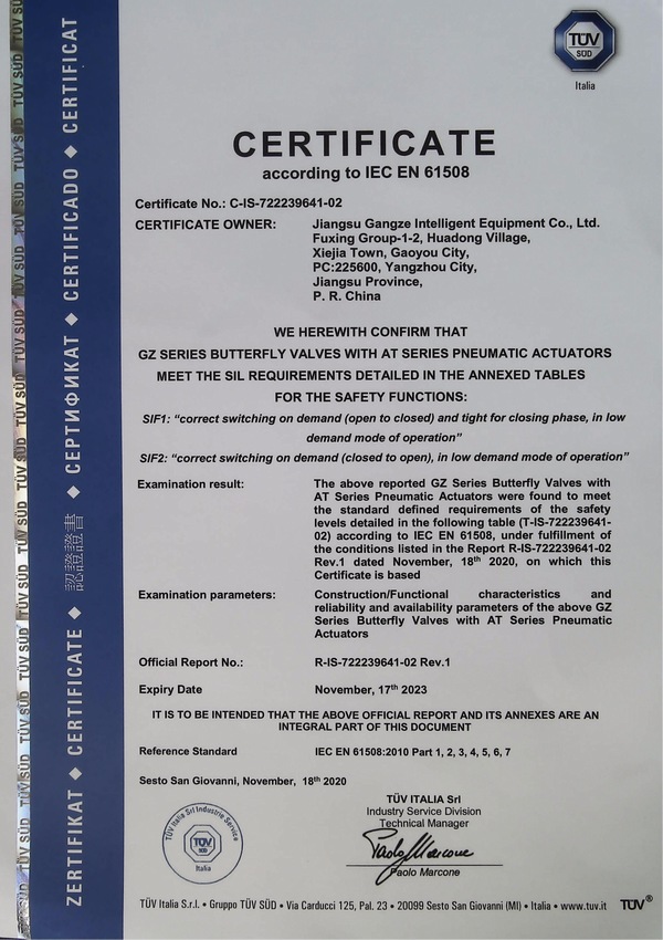 SIL认证书(阀门)
